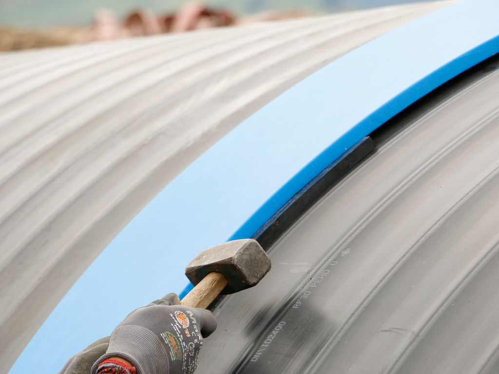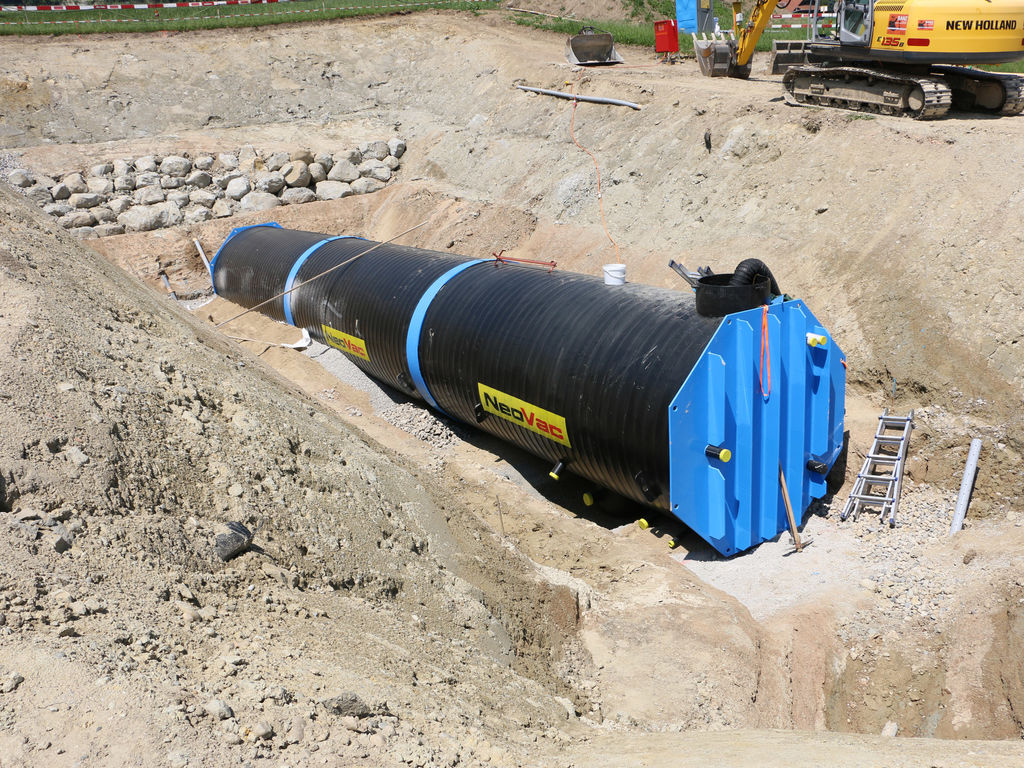 Im ersten Segment wurde der Trockenraum mit Domschachteinstieg und Drucktüre verbaut. Der erste Teil wiegt über 2’450 Kilogramm. Der zweite, mit 2’550 Kilogramm etwas schwerere Rohrteil, beinhaltet die Wasserkammer und besteht aus zwei 6 Meter langen Segmenten, die bereits in der Werkstatt zusammengeschweisst wurden. Die beiden Rohrteile wurden hingegen direkt vor Ort in der Baugrube zusammengeschweisst. Im Reservoir lagern seither hoch über Schachen 60 m3 Trinkwasser.