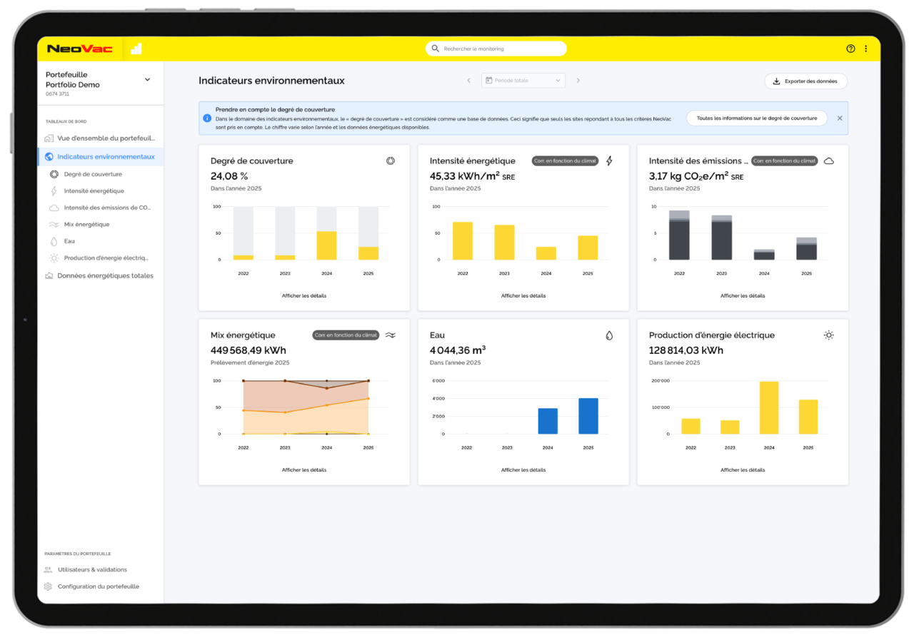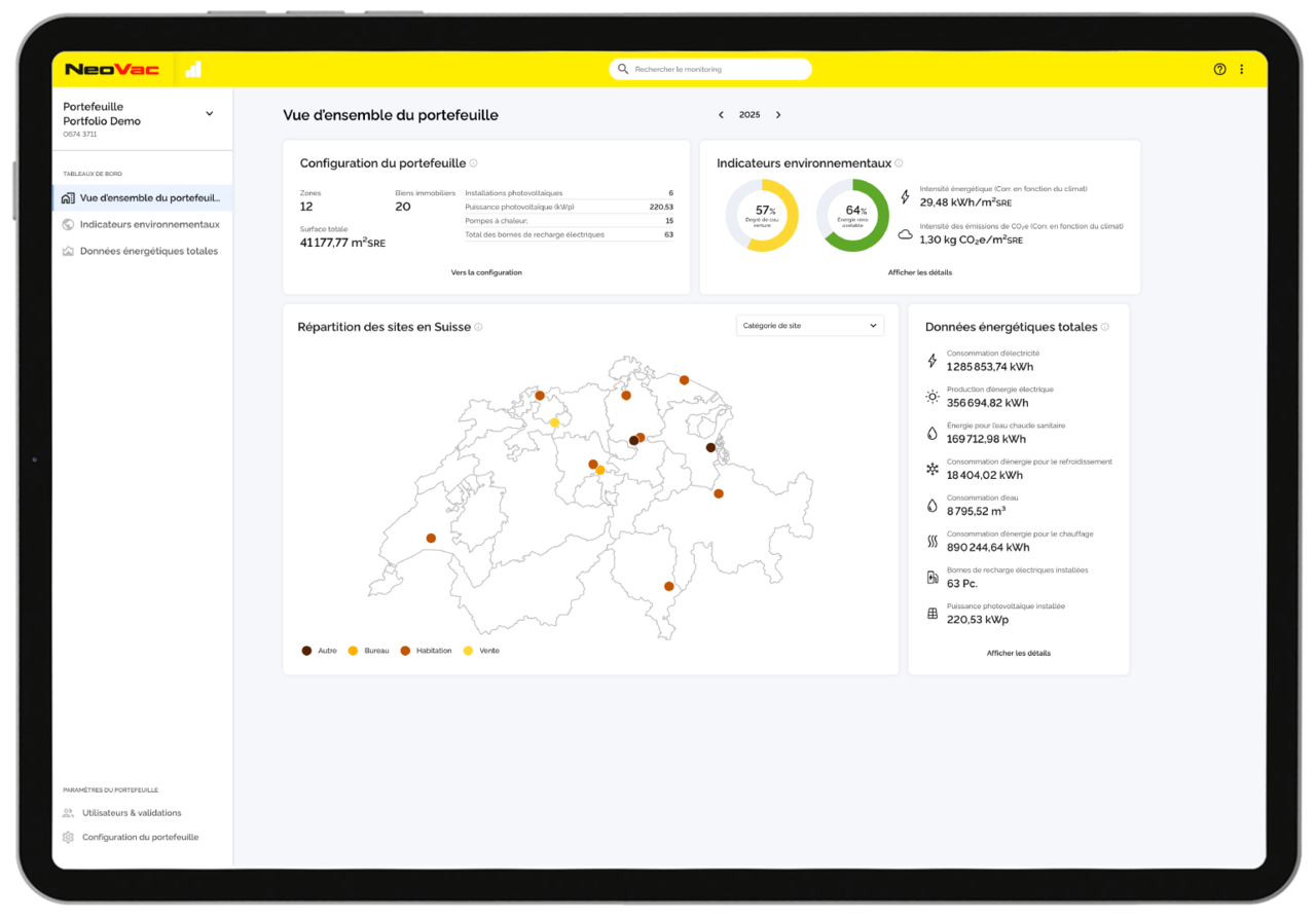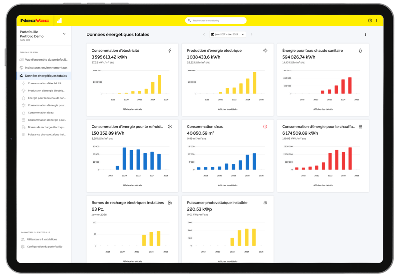 NeoVac propose des solutions de monitoring énergétique adaptées à chaque besoin, de la solution pratique pour débutants au pack complet pour des portefeuilles entiers, en passant par l’outil professionnel pour la gestion immobilière et les spécialistes des installations. Toujours dans le but d’optimiser l’efficacité énergétique et de tirer le meilleur parti de la technique du bâtiment.