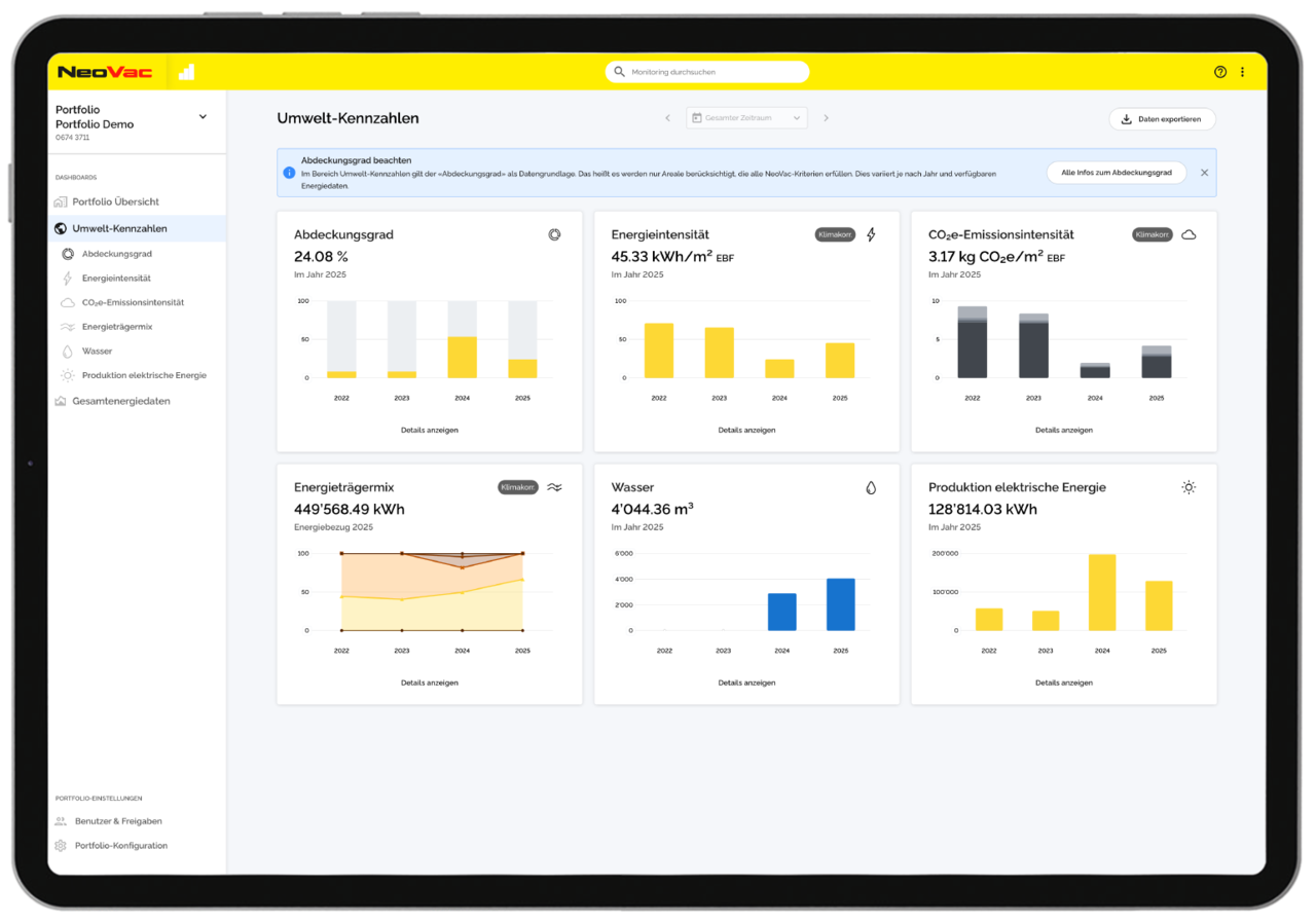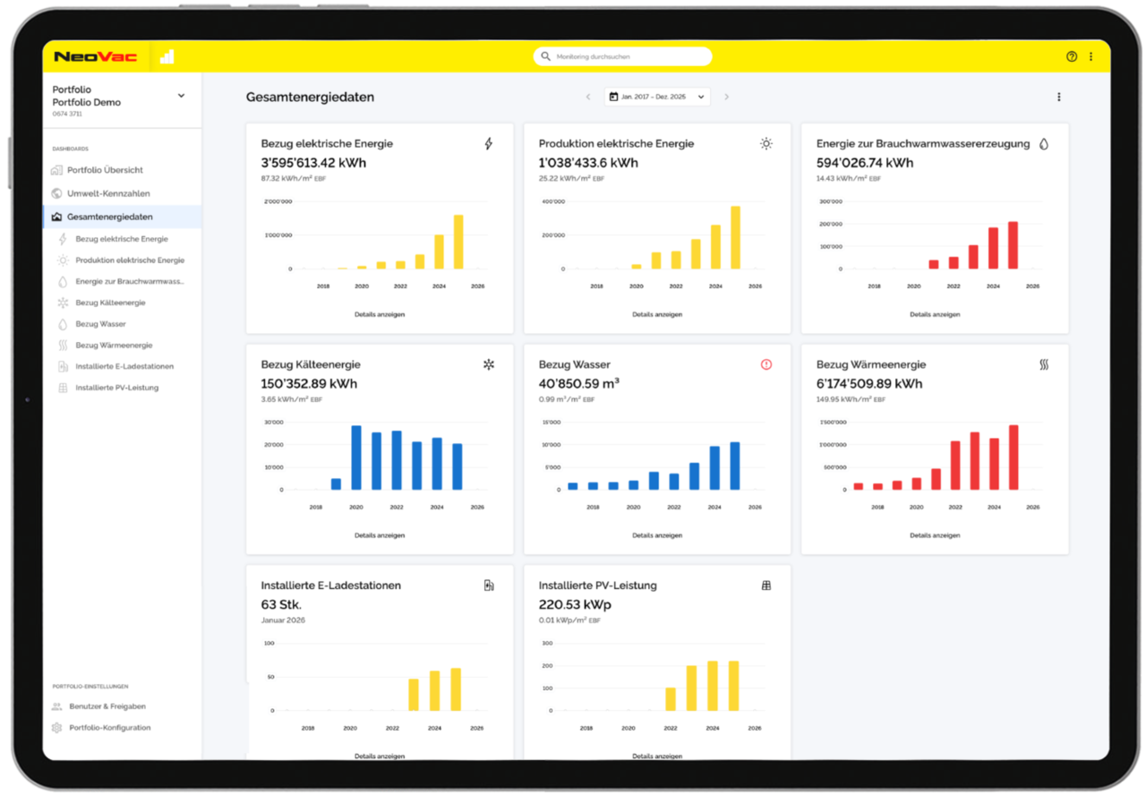 Mit «Monitoring Portfolio» bietet NeoVac eine vollautomatisierte Lösung für ein Umweltcontrolling über gesamte Immobilienportfolios hinweg. Von der Strategieplanung über die Umsetzung und Datenerfassung bis zur Visualisierung und dem Reporting liefern wir alles aus einer Hand.
